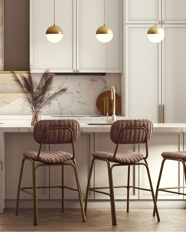 Odaberite privlačne visilice ili lustere koji ne samo da će osvijetliti prostor, već će također donijeti vizualnu zanimljivost prostoru. Razmislite o materijalima poput stakla, mesinga, ratana ili keramike koji mogu dodati šarm monokromnoj kuhinji. Uz ravjetu, prostoru boju i toplinu možete dodati pravim izborom barskih stolica. Odvažite se na dizajn zanimljivog oblika, boje ili tekstila koji će podići prostor na novu razinu.