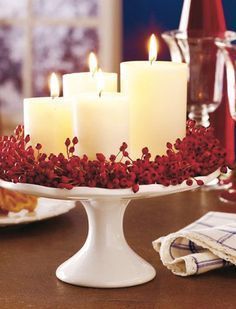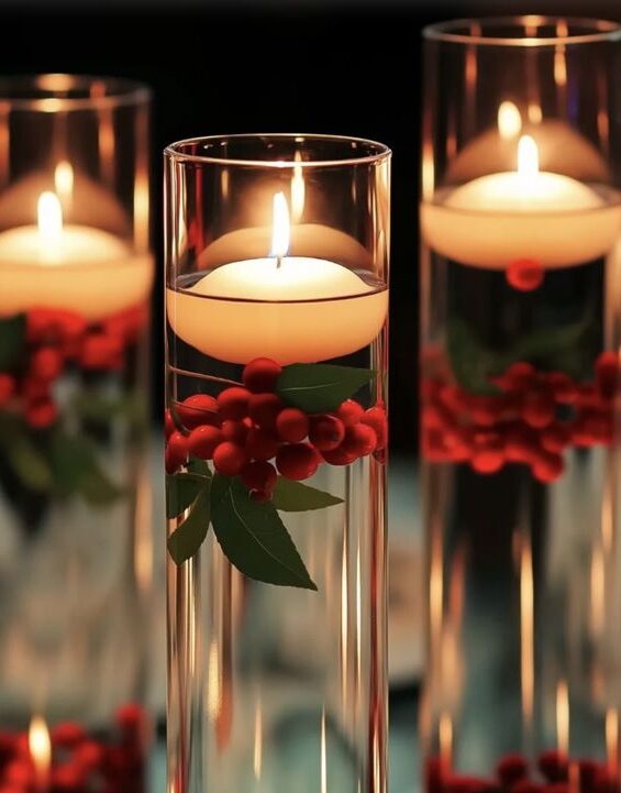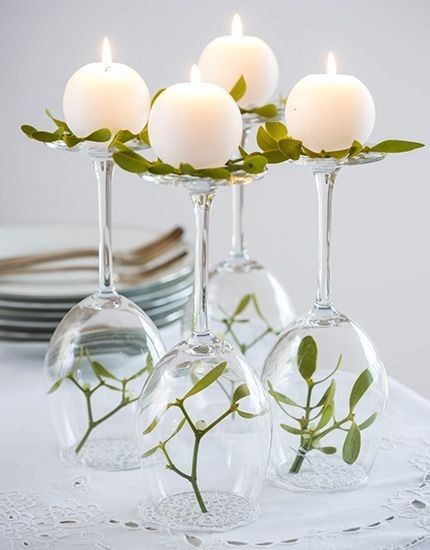 Jednostavan trik za bogatiji izgled stola postignuti možete uz čaše i svijeće. Pronađite male okrugle svijeće i postavite ih na listove eukaliptusa ili slične biljke na vrh čaše za vino. U dno čaše možete postaviti još listova ili drugih božićnih ukrasa. Na sličan način poigrati se možete i s običnim visokim čašama u koje možete staviti crvene bobice i plutajuće svijeće na vodi.