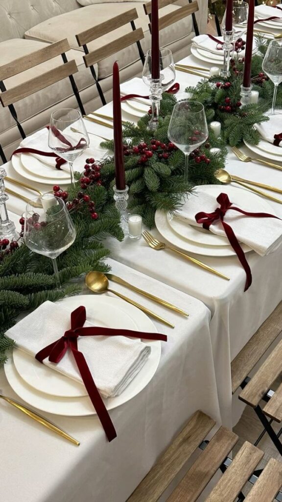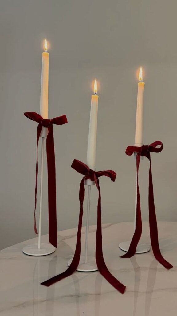 Baršunaste ili satenske vrpce idealne su za kreiranje mašni u različitim kutovima vašeg doma. Iskoristiti ih možete za blagavaonskim stolom oko ubrusa ili čaša, a posebno lijepo izgledaju uz svijeće. Uz tradicionalno božićne boje, zelene i crvene, slobodno se poigrajte i s drugim bojama poput srebrne, roze ili zlatne koje će donijeti dašak elegancije i glamura i time podići cjelokupni izgled vašeg prostora.