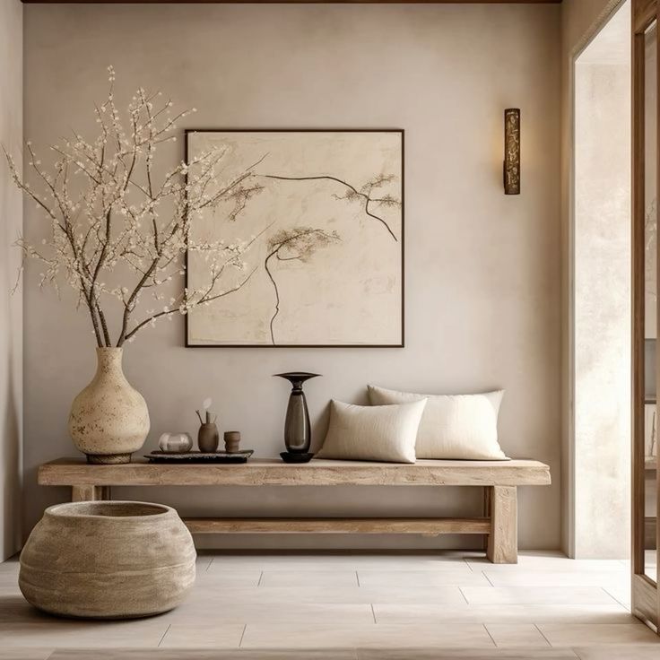 - Dekorativni elementi: Jednostavne japandi interijere najčešće upotpunjuju biljke, apstraktne slike, skulpture i keramika. Japandi stil osobito voli umjetnost i ručne radove koji slave nesavršenost, organičke i nepravilne oblike te volumen i teksturalnost. Ako ste u procesu kreiranja japandi interijera, istražite radove lokalnih umjetnika koji će u vaš dom unijeti posebnu dubinu i autentičnost.