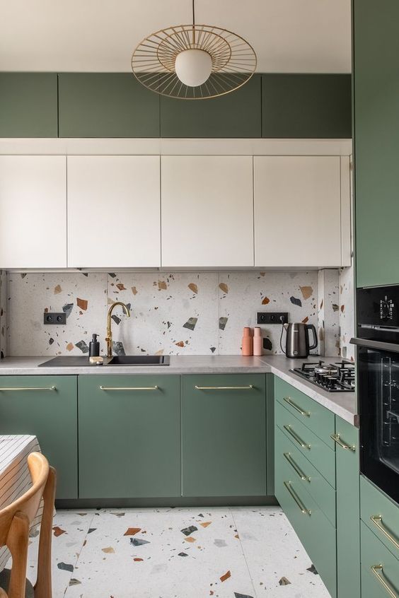Terazzo pločice: Za one koji svojoj kuhinji žele dodati više boje i razigranosti kroz uzorak, terazzo je idealna opcija koja djeluje prirodno i otmjeno u isto vrijeme. Pronađite terazzo pločice koje u sebi imaju zelenu boju i kombinirajte ih uz zelene fronte ili se odlučite za potpuno krem/bijele terazzo pločice koje se s lakoćom slažu uz zelene fronte.