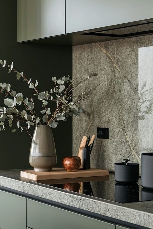 Pločice prirodnog izgleda: Za one koji svojoj kuhinji žele dodati eleganciju i luksuz, pločice koje imitiraju kamen ili mramor sa zelenim venama ili mrljama odlično se slažu uz zelene fronte. Ovakve pločice bezvremenski su izbor jer prostoru dodaju toplinu i teksturu, sveukupno vizualno bogatstvo.