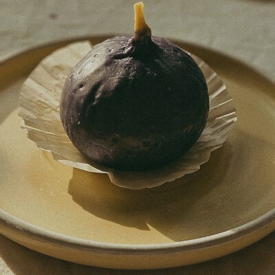 Ručno rađena svijeća u obliku smokve, od 100% soja-kokos voska, s mirisom Pain au chocolat.