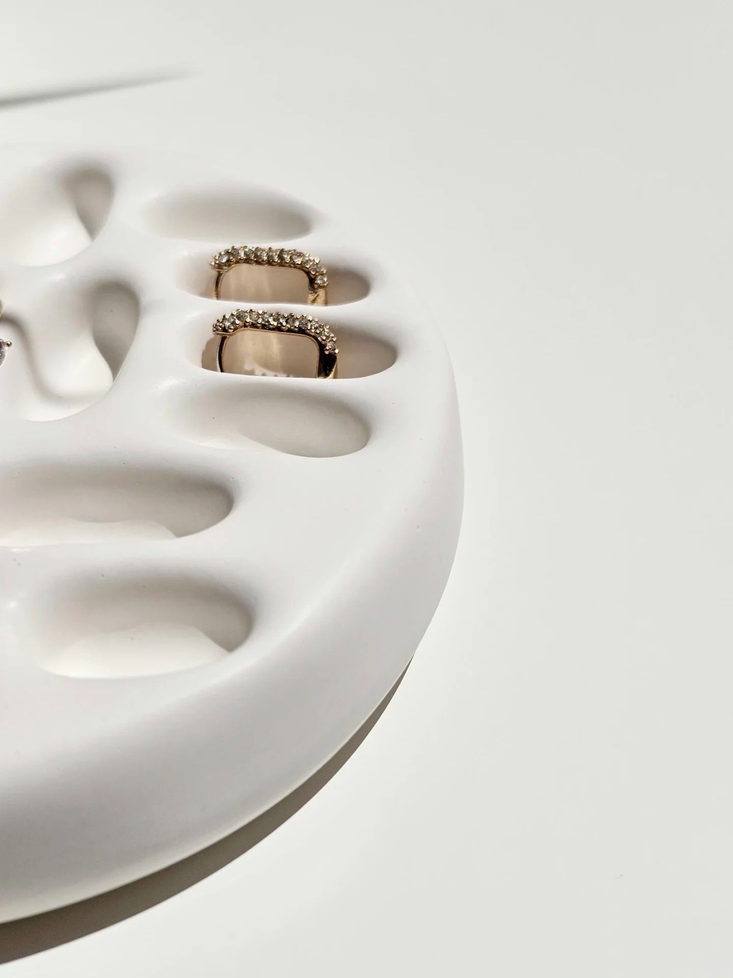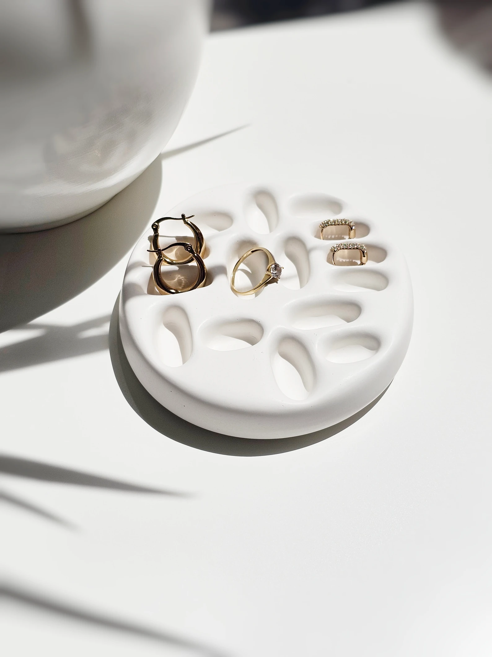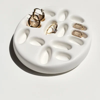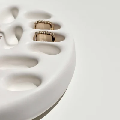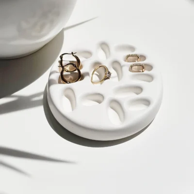 Unikatan komad za odlaganje prstenja u bijeloj boji, estetski upečatljiv.-