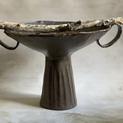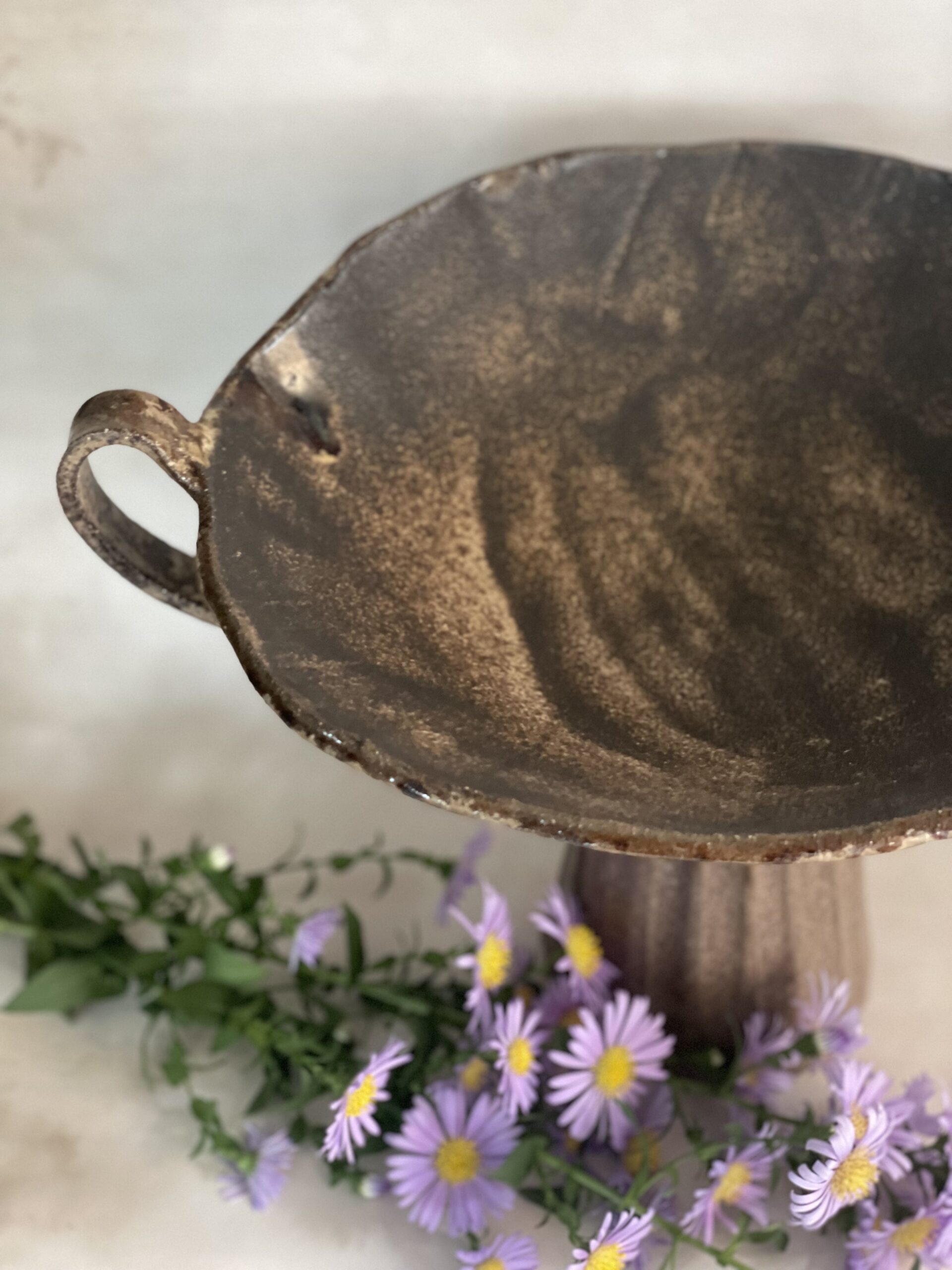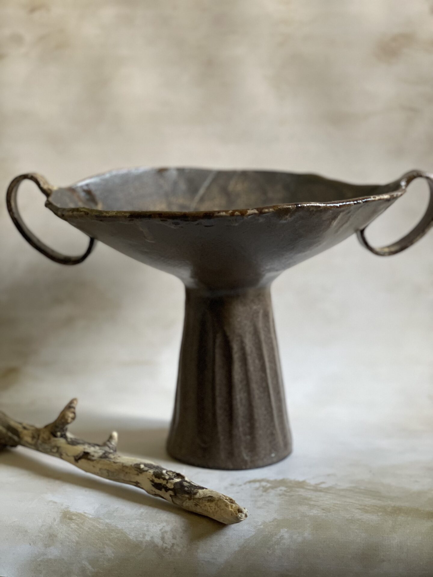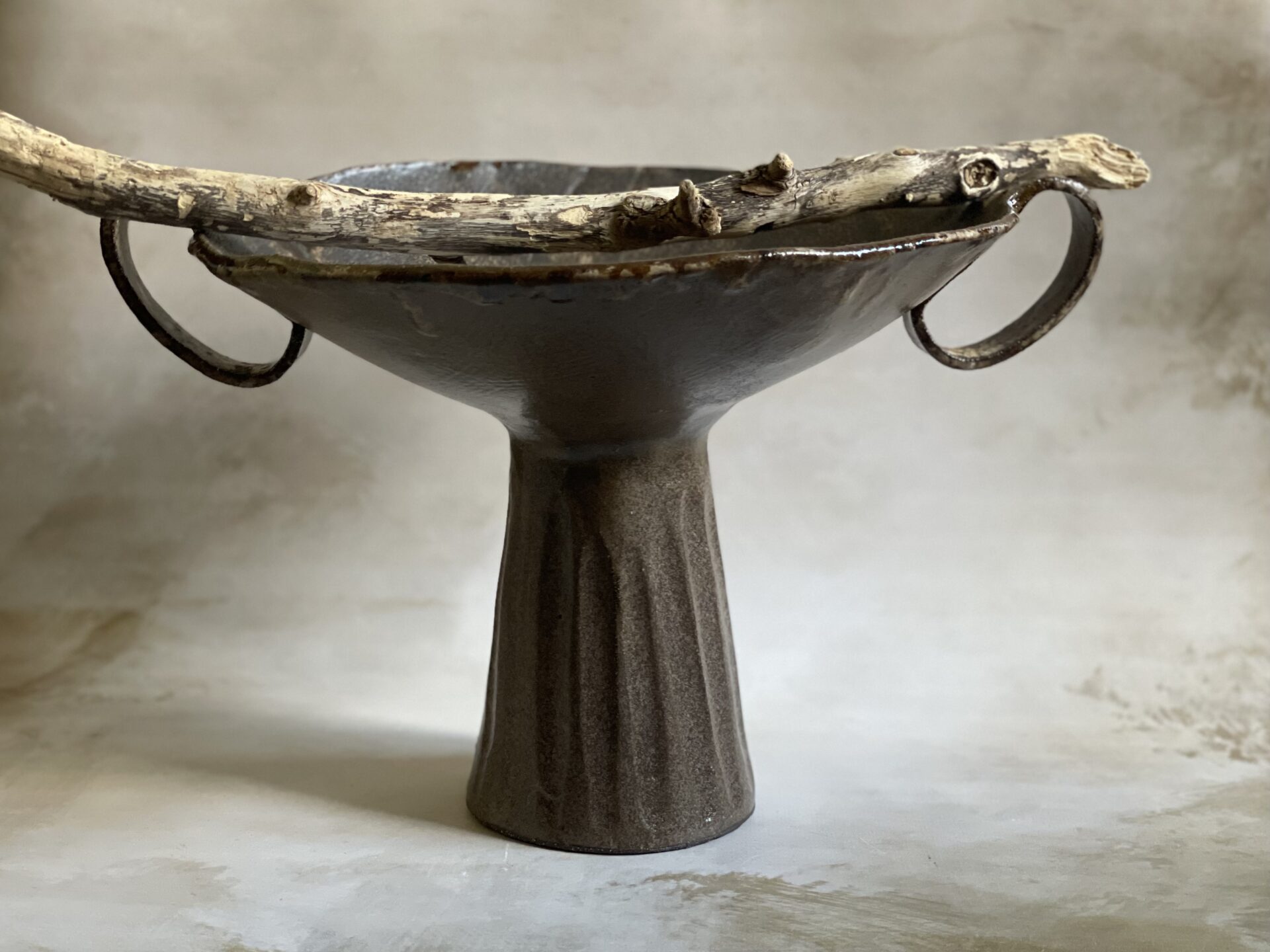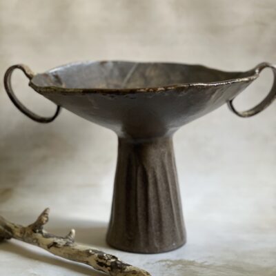 Ručno rađena pijedestalna zdjela od smeđe šamotirane stoneware gline, glazirana smeđom mat glazurom izunutra i čokoladnom sjajnom glazurom izvana, te završno pečena na 1200 stupnjeva. Koristi se kao uporabni ili ukrasni predmet. Može služiti kao zdjela za voće ili kao jedinstveni ukras na stolu.