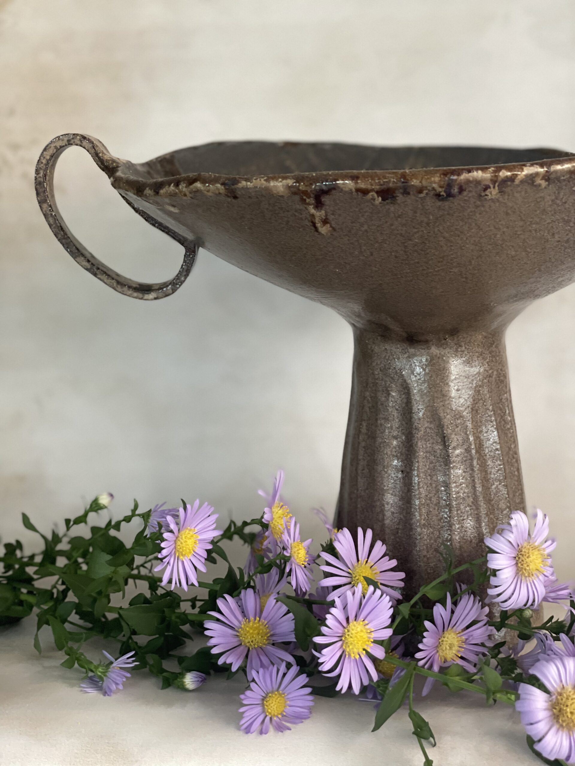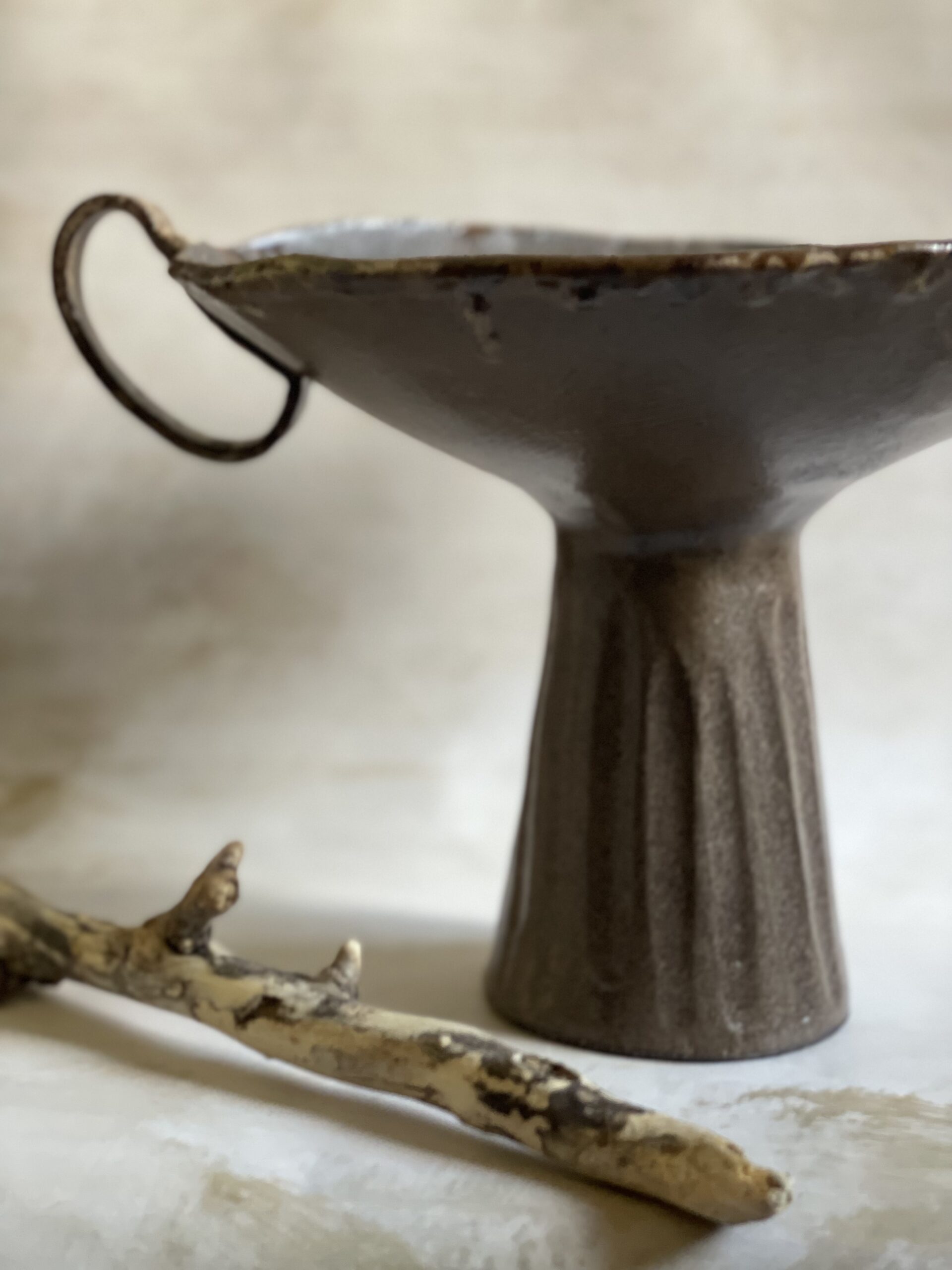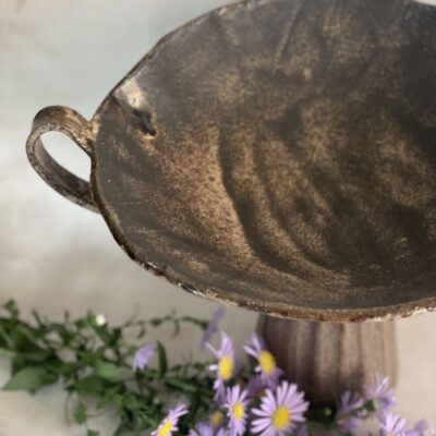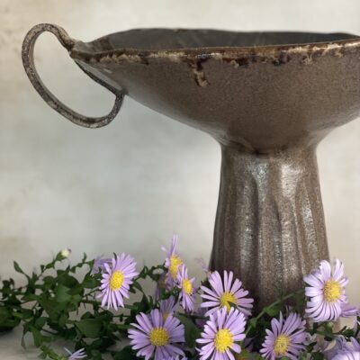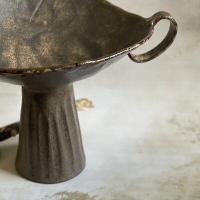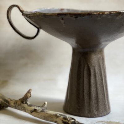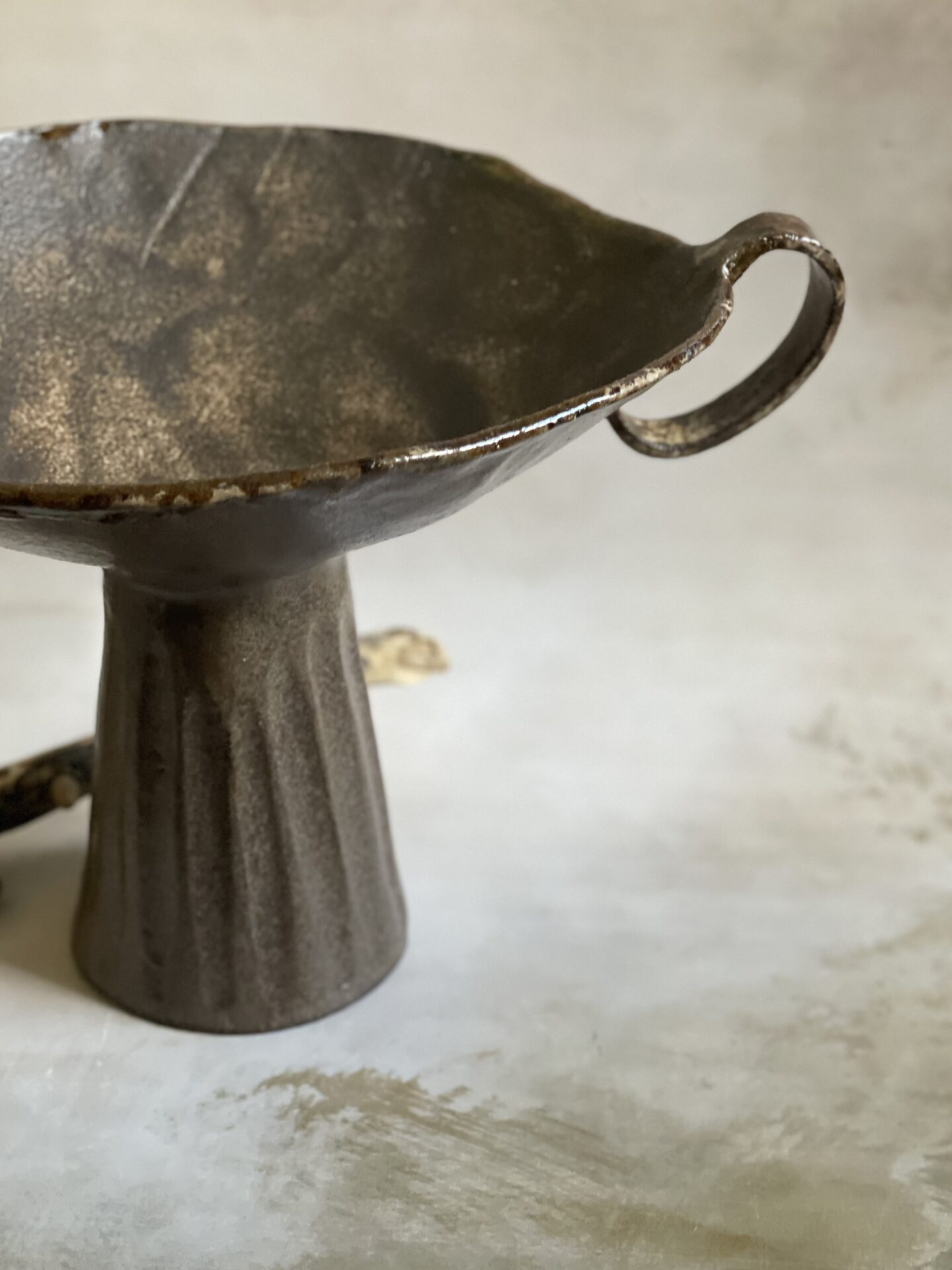 Ručno rađena pijedestalna zdjela od smeđe šamotirane stoneware gline, glazirana smeđom mat glazurom izunutra i čokoladnom sjajnom glazurom izvana, te završno pečena na 1200 stupnjeva. Koristi se kao uporabni ili ukrasni predmet. Može služiti kao zdjela za voće ili kao jedinstveni ukras na stolu.