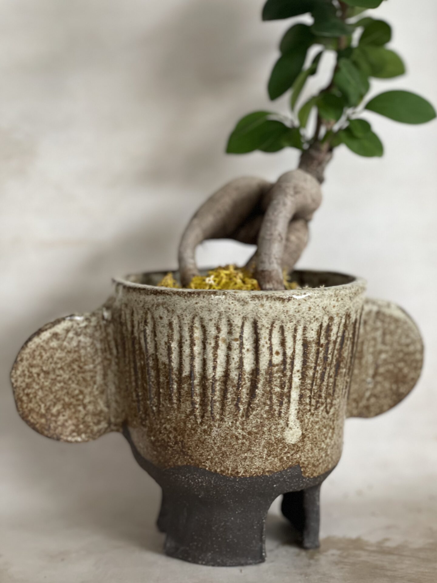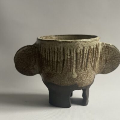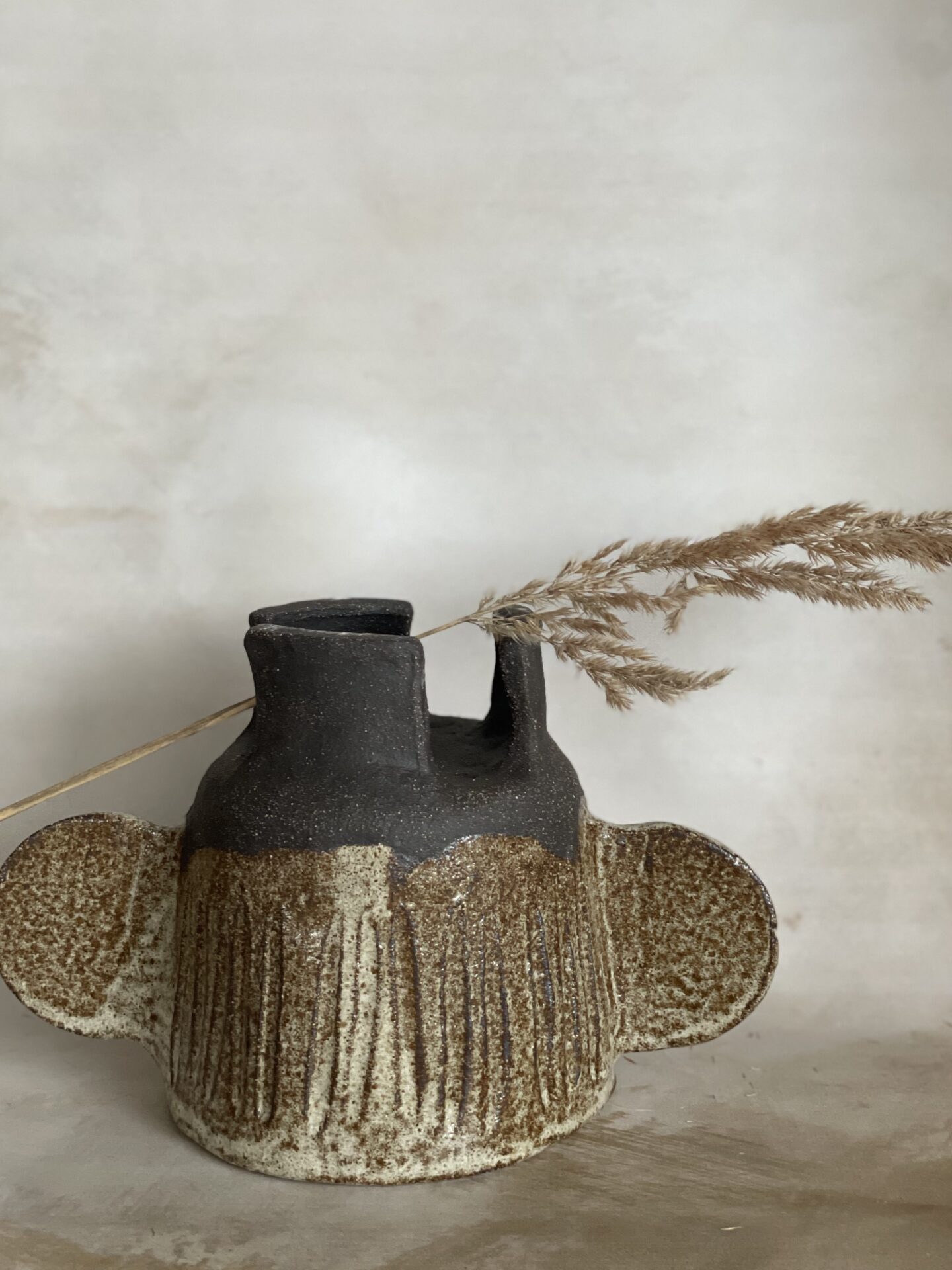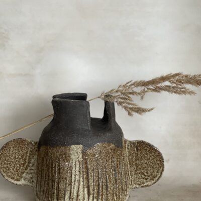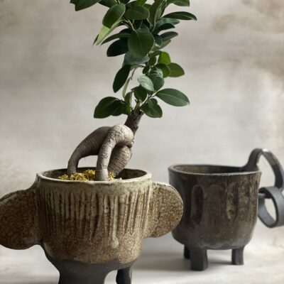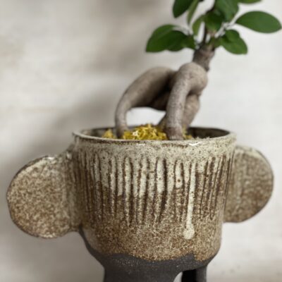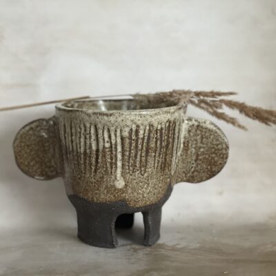 Ručno rađena vaza za živo cvijeće, od smeđe šamotirane stoneware gline, glaziran bež sjajnom glazurom i završno pečen na 1200 stupnjeva. Koristi se kao uporabni predmet za sadnju živoga cvijeća.
