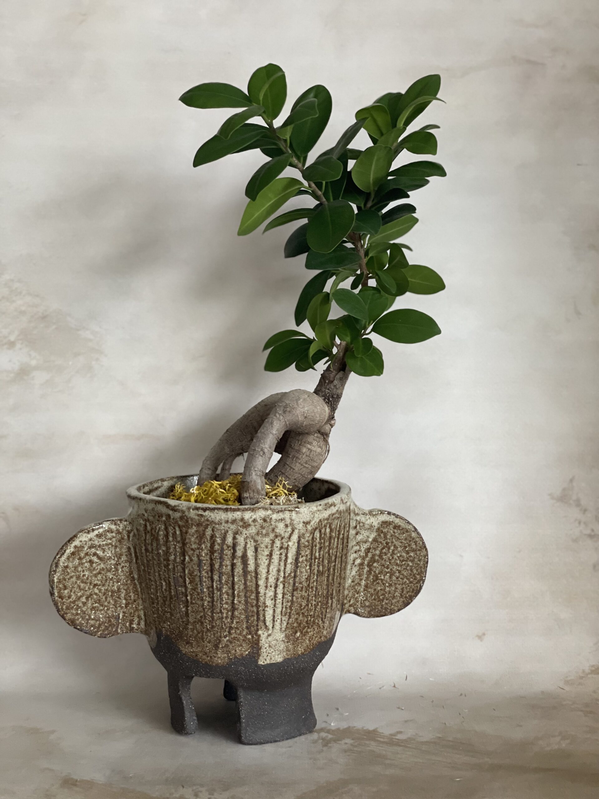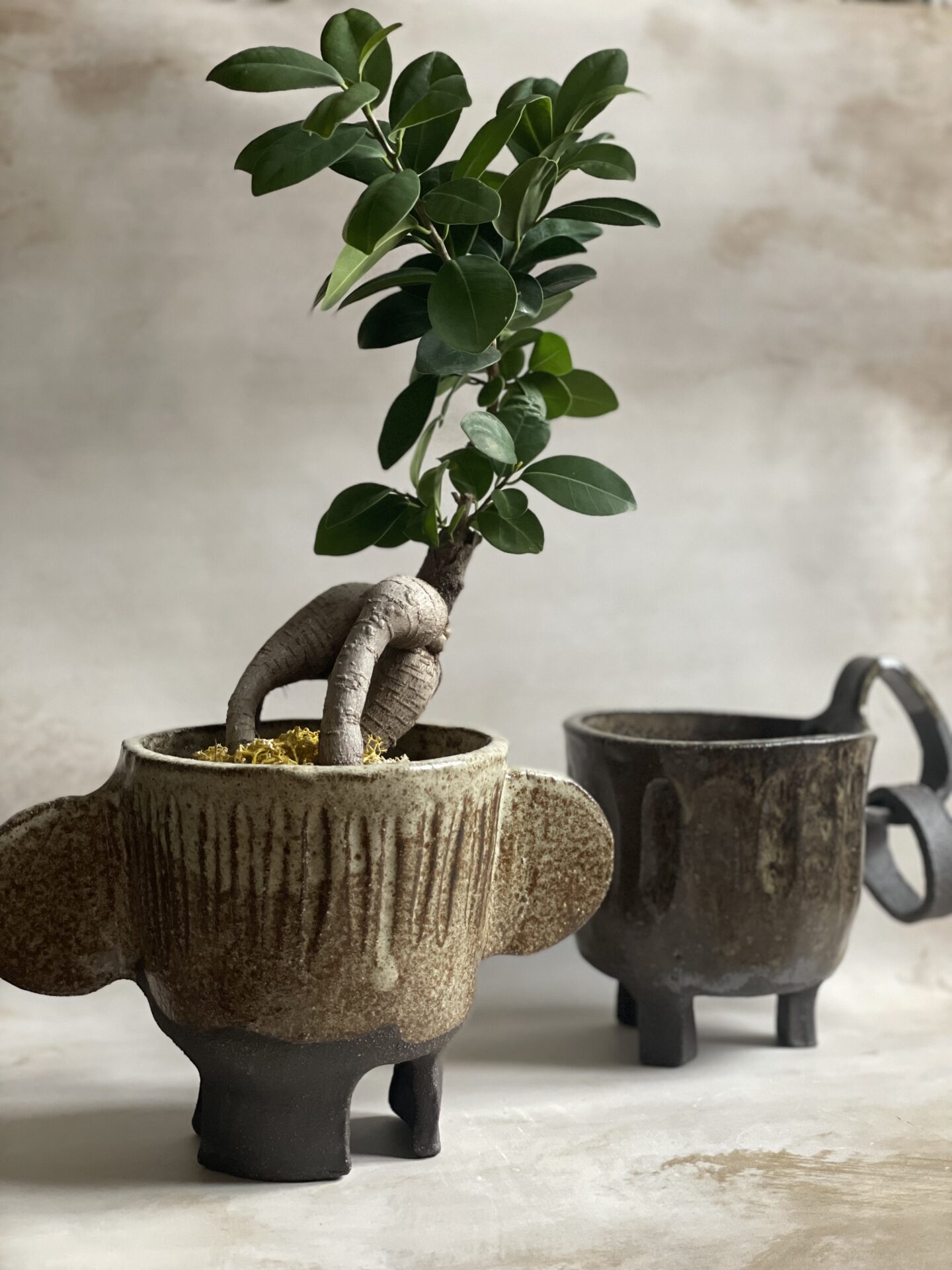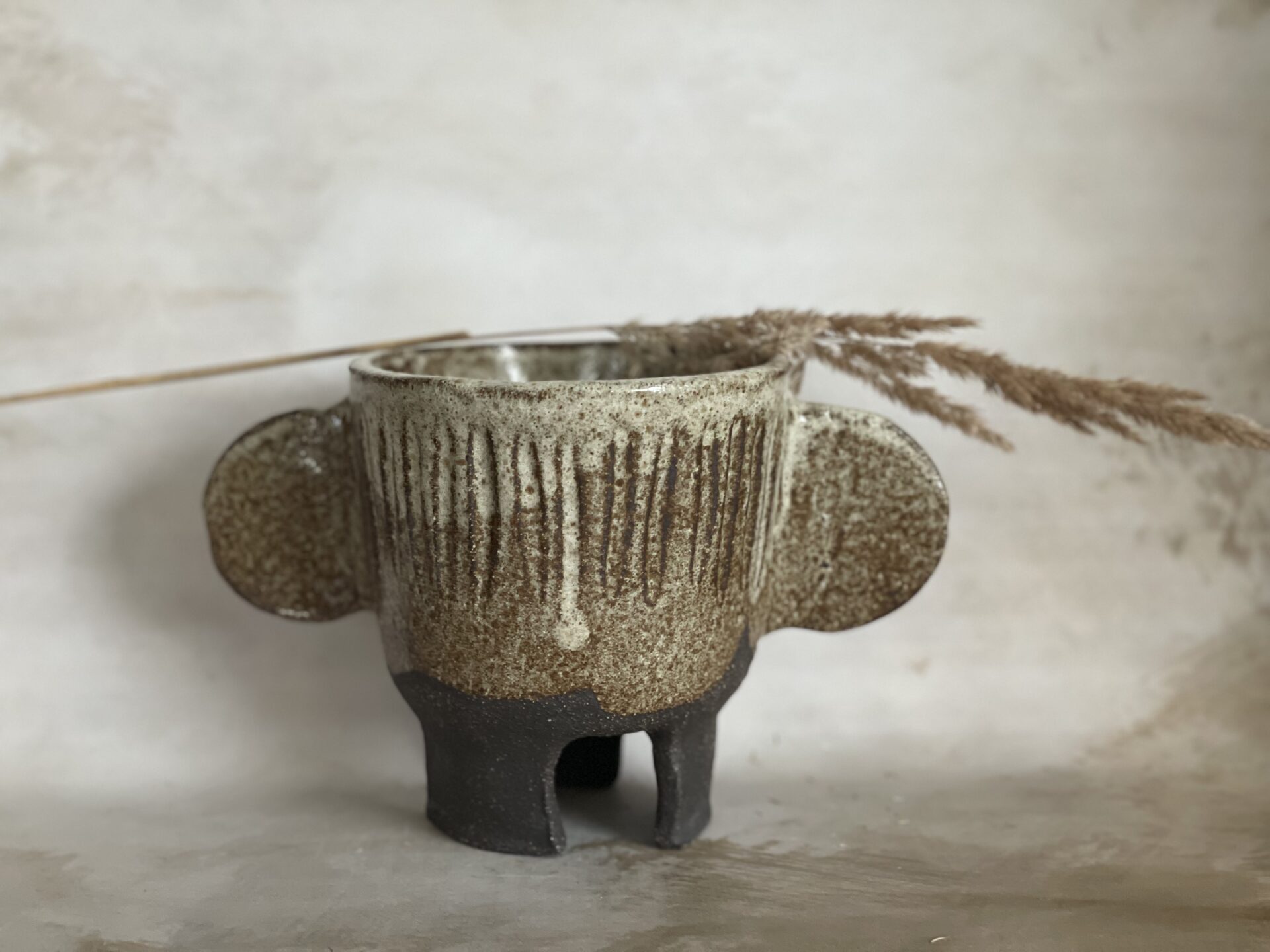 Ručno rađena vaza za živo cvijeće, od smeđe šamotirane stoneware gline, glaziran bež sjajnom glazurom i završno pečen na 1200 stupnjeva. Koristi se kao uporabni predmet za sadnju živoga cvijeća.
