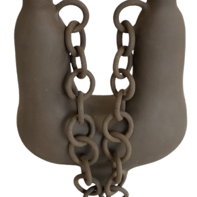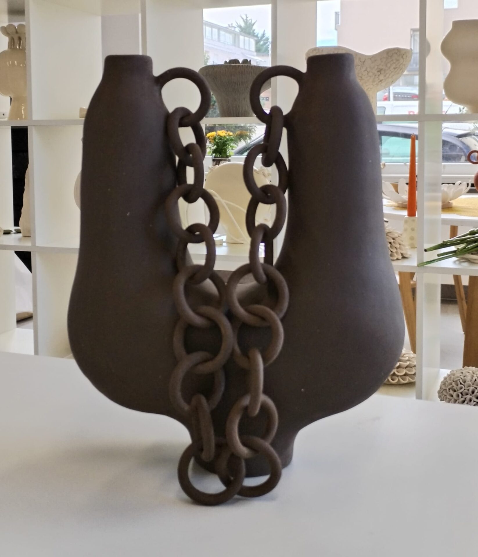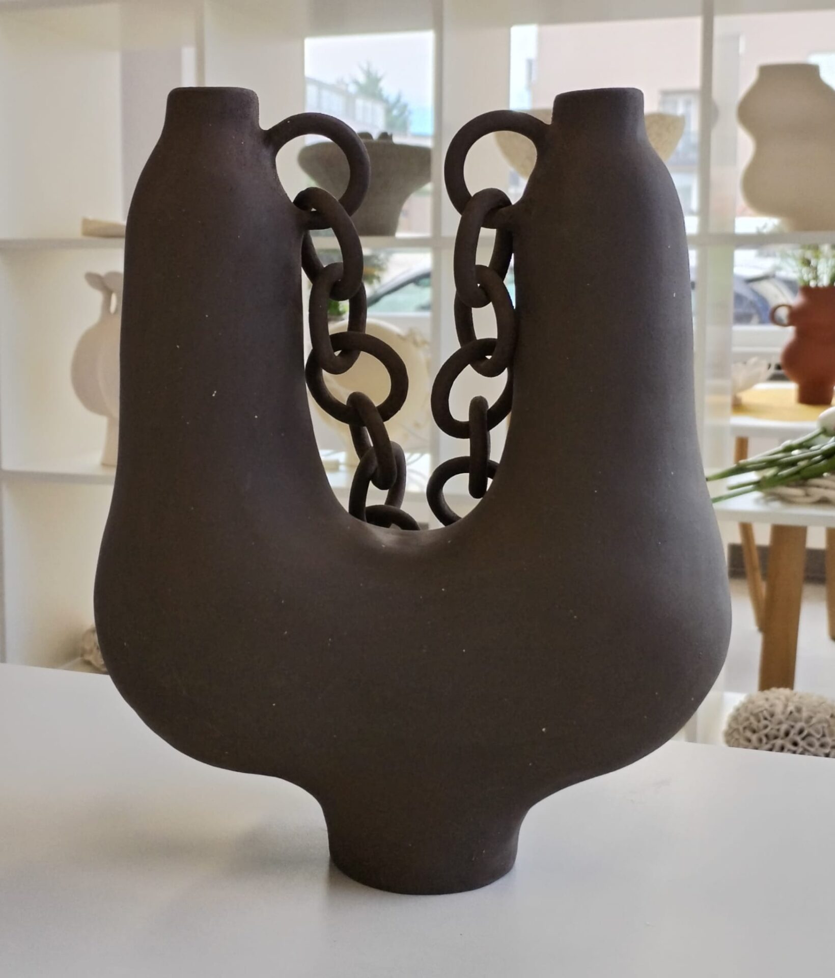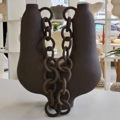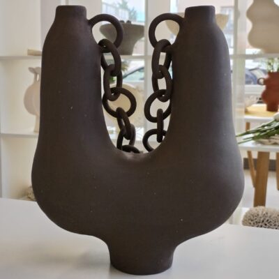 Vaza U s lancem smeđa - keramika, (smeđa glina sa šamotom 0,2) rukom oblikovana.Svaka je karika pažljivo oblikovana i povezana u čvrstu cjelinu. U lancu ja vidim veze koje nas spajaju u zajedništvo, a ne okove koji nas sputavaju. A ti?