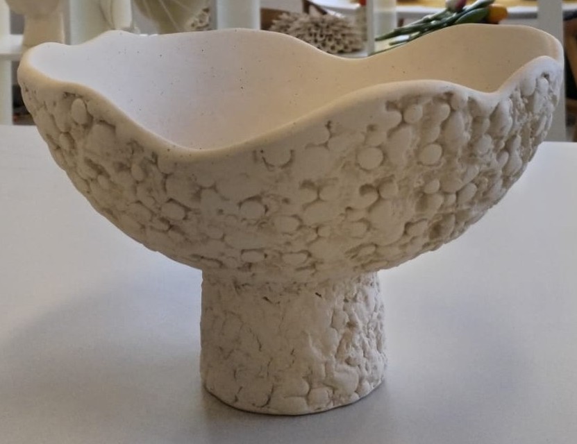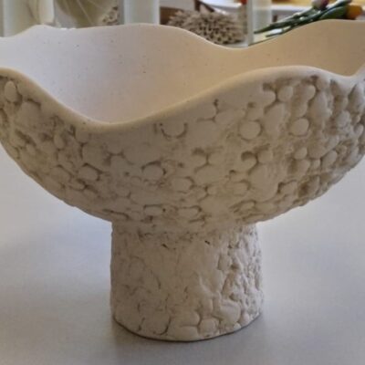 Zdjela Ugljan L – izrađena od bijele gline sa šamotom (0,5). Reljefni otisci na svježoj glini utisnuti su kamenčićima sa sunčanih plaža mog dragog Ugljana, stvarajući jedinstvenu teksturu i osobnu priču. Dostava je uključena u cijenu.